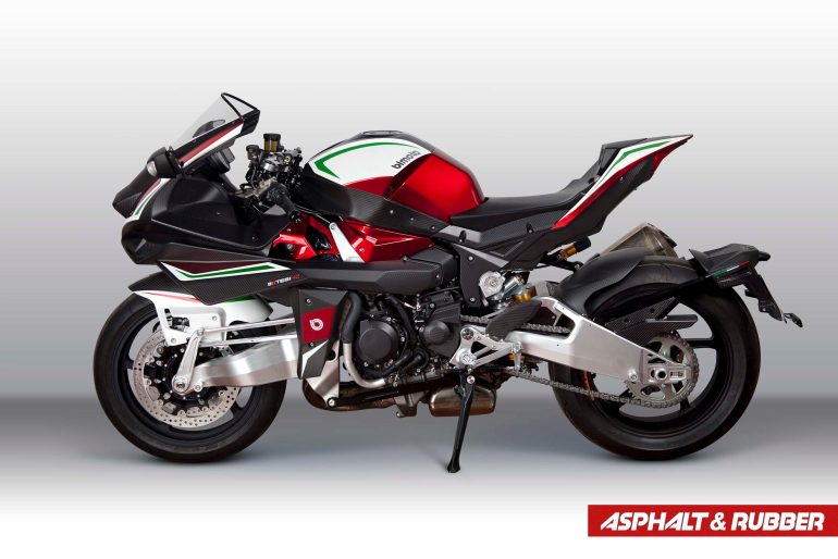 Bimota is finally ready to talk about horsepower figures from the supercharged four-cylinder engine, with 228hp (170 kW) claimed. That figured bumps up to 238hp (178 kW), when you take into account Kawasaki’s infamous “Ram Air” power figure measurements.