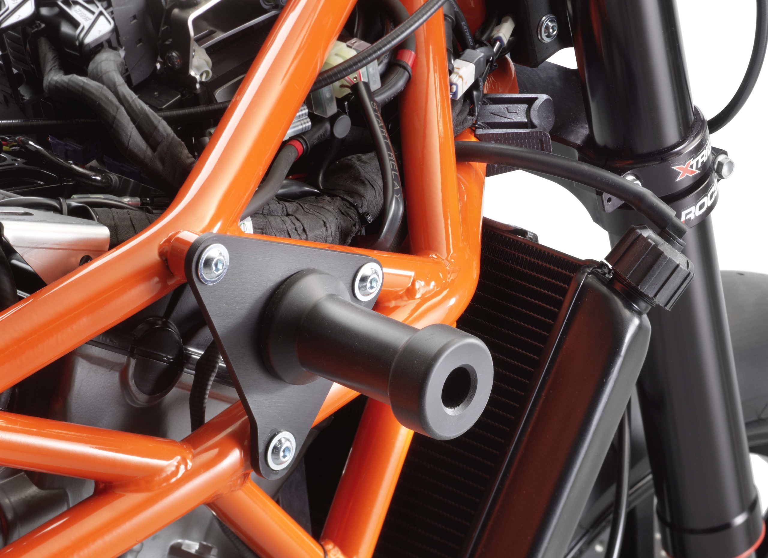 We can see more easily here the crash bobbins that are mounted to the frame on a three-pointed plate, which helps distribute around the frame the impact forces of a crash, thus helping to avoid a bent chassis during a high-speed off.