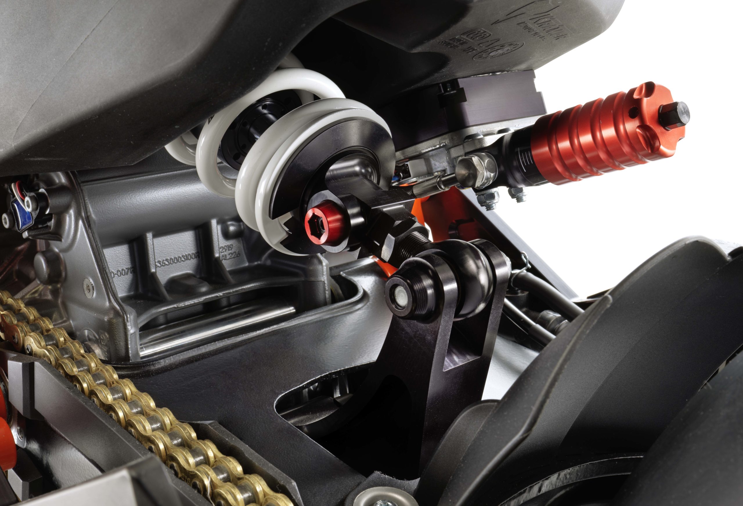 The aluminum swingarm has a removable chin scoop, which was the height of controversy in MotoGP not so long ago, and of course KTM has developed winglets for the front of the bike as well.