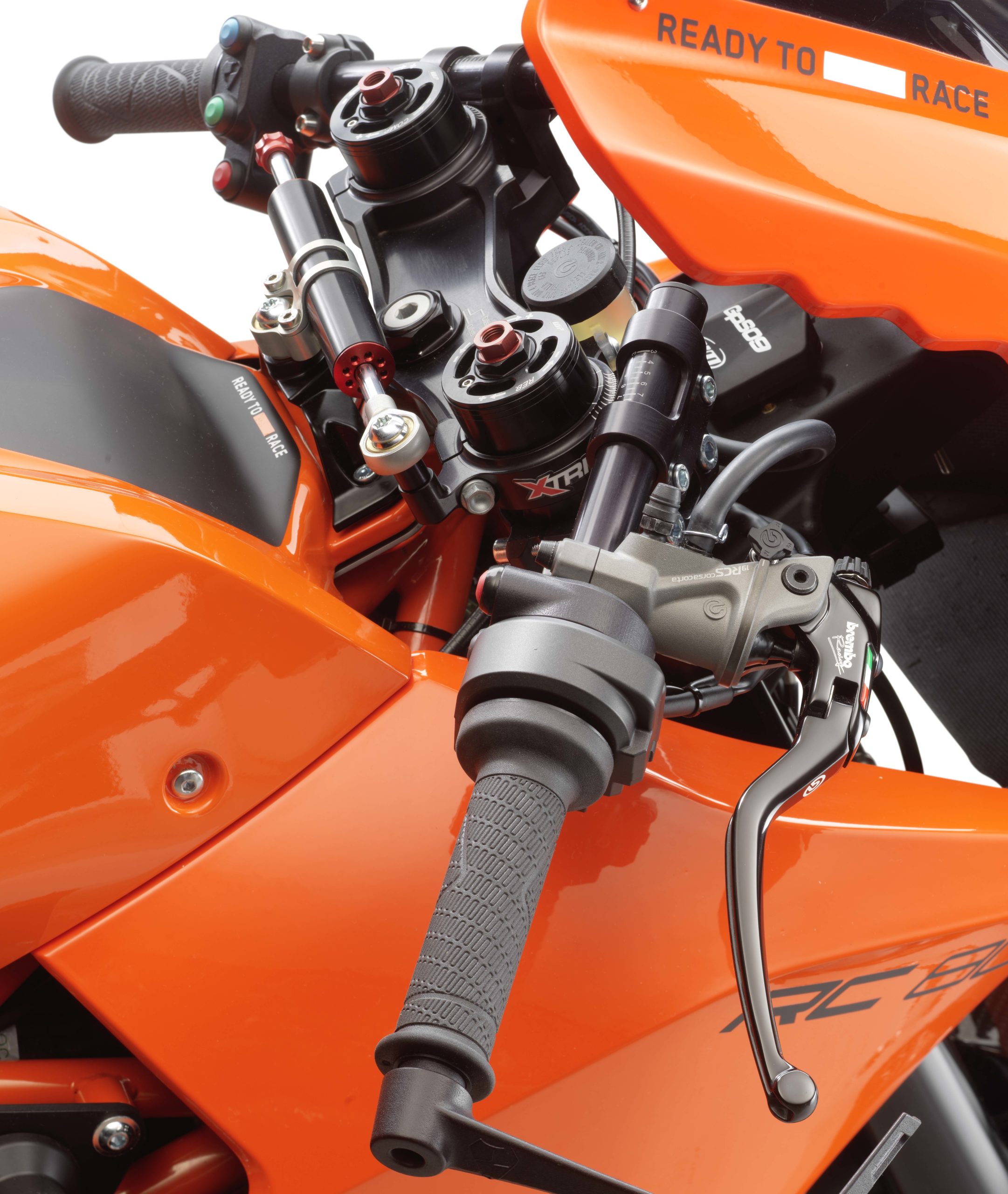 With forged aluminum Dymag wheels as standard, you can also find carbon pieces that fit the KTM RC 8C front end as well, from the British wheel-maker.